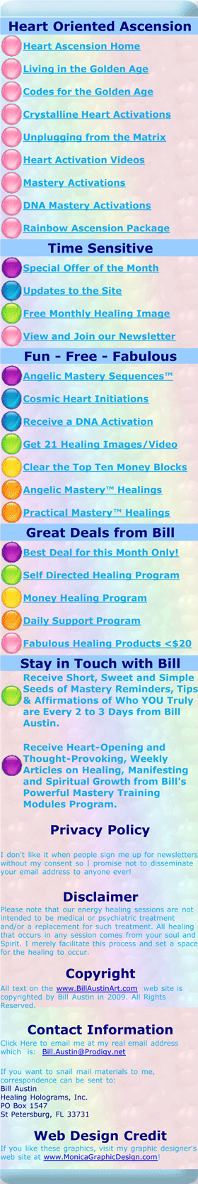 Each part of Unplugging from the 3D Matrix costs $144 and if you order all six parts at the same time the cost would be just $450. As soon as you place an order, you will receive a link where you may download the images for this Mastery Activation as well as instructions as to how to download, receive and accept the activation itself. If you have any questions, please email Bill.Austin@Prodigy.net